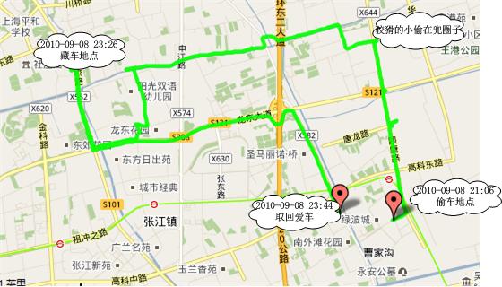 (以下摘自用户博文,略作修改)我是沪CE9475的车主。9月19日下午1点半左右,我把车停在孙桥殷军路办事,没想到我前脚上楼,几分钟后就接到报警电话,说我的车非法移动,我马上通过手机一看,显示我的车在科苑路。我马上和同事们一起开车到科苑路,发现那里什么也没有。这时候我才想起打400电话,客服人员告诉我,我的车已经在三桥镇,而且已经被停好了。我再赶到三桥,摩羯星的小吴这时候已经赶到三桥,通过他,我们进一步锁定了车的大概位置。但是那个地方都是私房,而且都是外来人员,等到4点左右警察来的时候,一家一家敲门,有的开门,有的不开门。然后我们又到金桥出口加工区派出所,调探头,通过摩羯星,我们准确的调出了偷车的二个人,都是男性,40岁左右,一个穿白衬衫,白裤子的开着我的摩托车,一个穿黑衣服带白太阳帽的开辆踏板车是他的同伙。